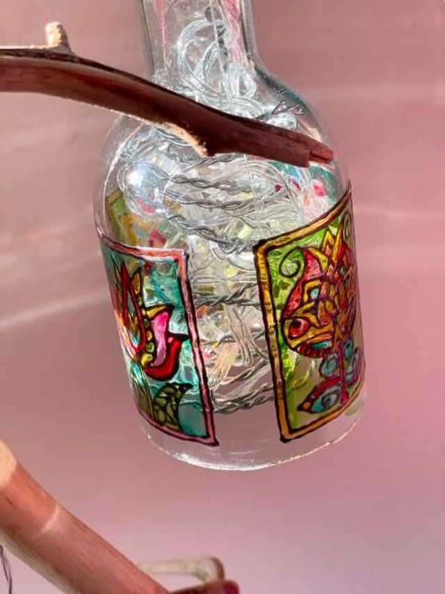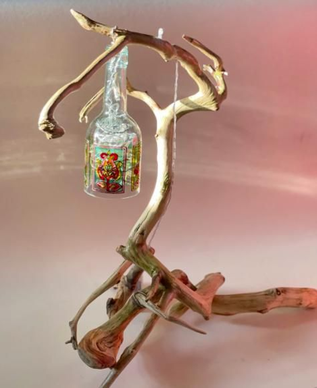 Driftwood lamp was created as a result of my love for recycling. I've been using cut bottles as packaging for a while, but I didn't know what to do with the other half. I decided to combine my hobby with being practical. I created hand-painted stained glass on half of the bottle that was not used for packaging. Thanks to this, charming lampshades that color the light in the room came out.