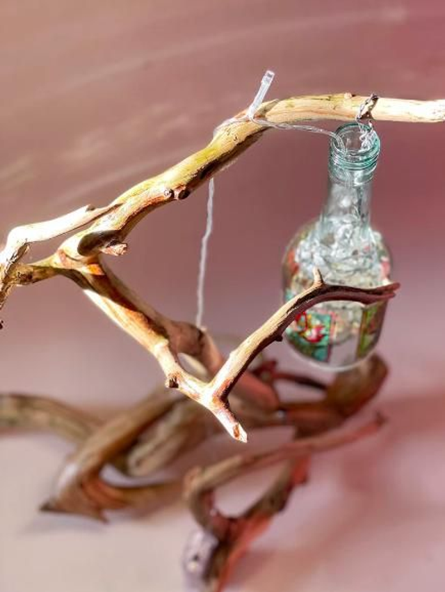 A free-standing lamp made of sea wood and recycled glass. Thanks to the use of led fairy lights, it does not require a socket and can be placed literally anywhere.