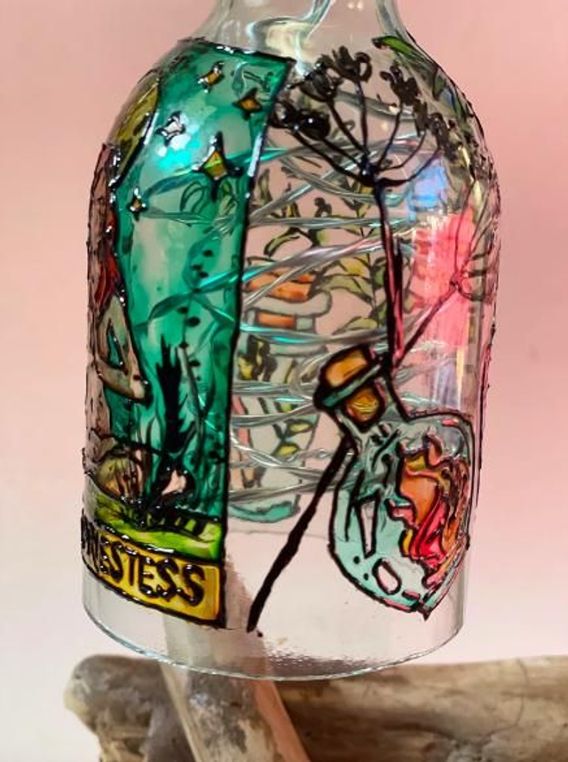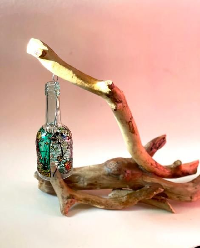 Driftwood lamp was created as a result of my love for recycling. I've been using cut bottles as packaging for a while, but I didn't know what to do with the other half. I decided to combine my hobby with being practical. I created hand-painted stained glass on half of the bottle that was not used for packaging. Thanks to this, charming lampshades that color the light in the room came out.