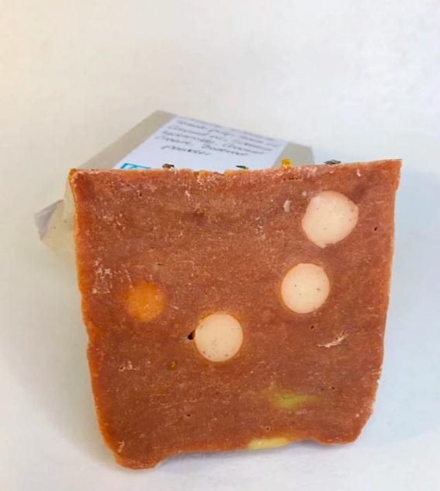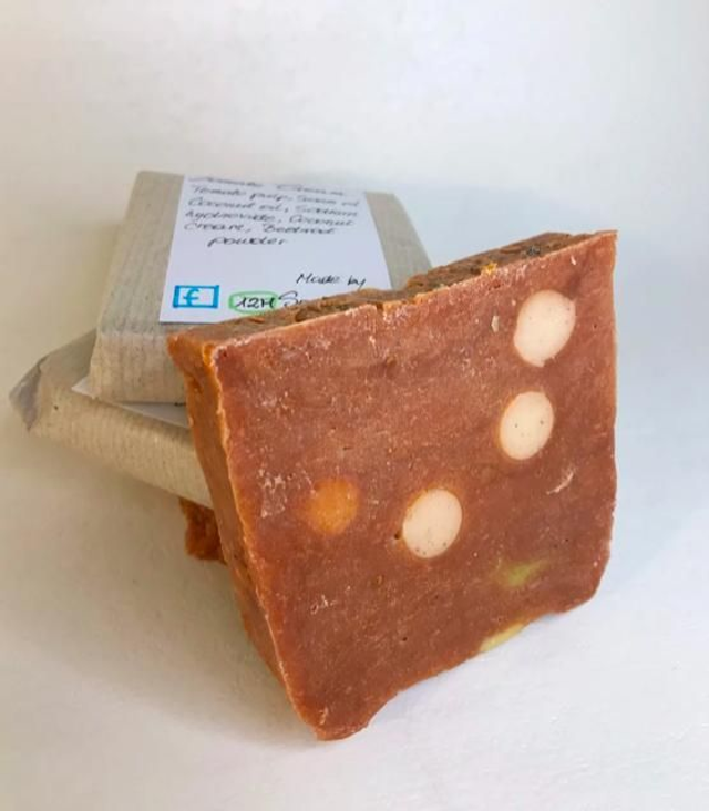 Hand-made soap containing tomato pulp, coconut cream, unrefined oils such as coconut oil, olive pomace oil and sesame oil.